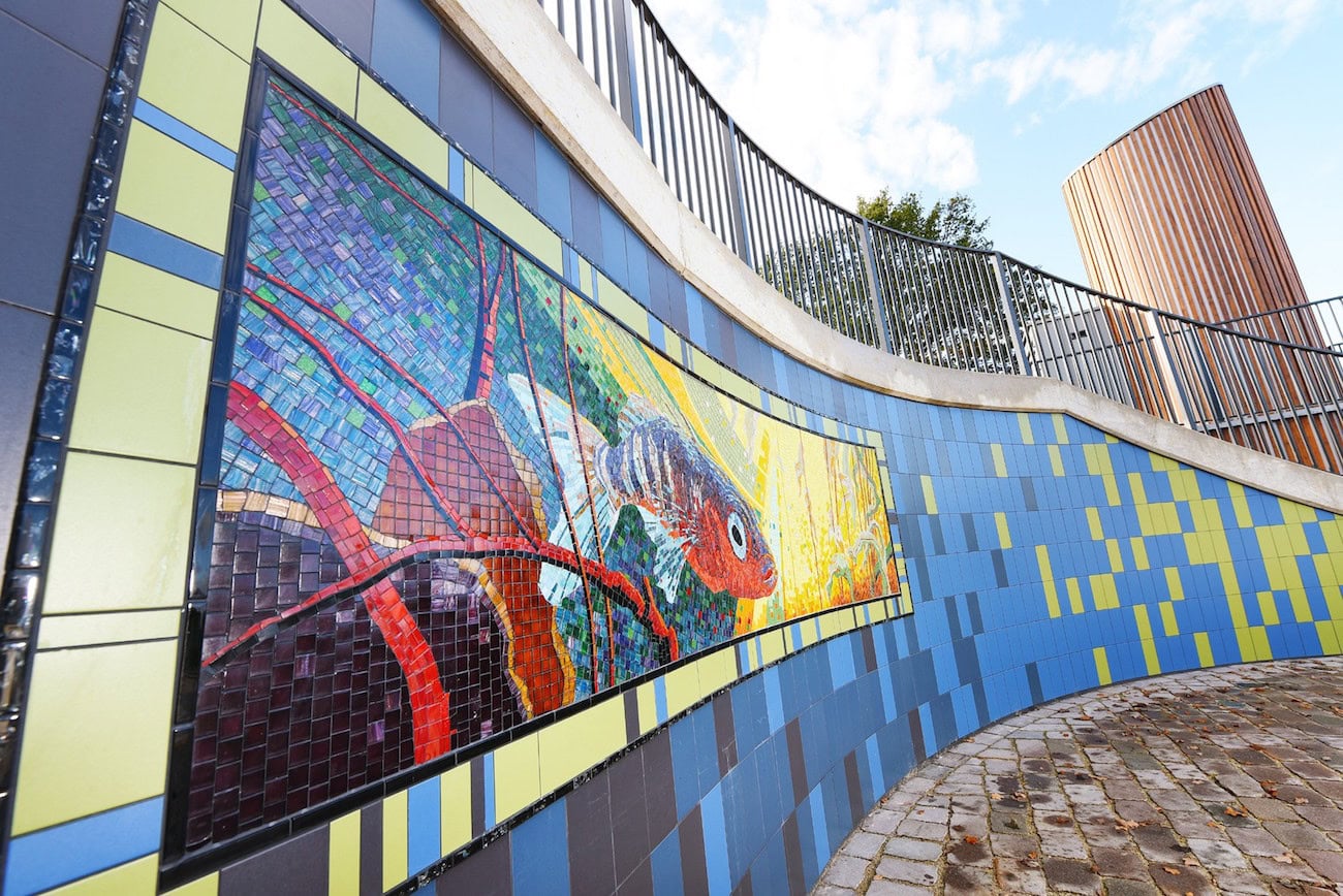 Kunstvolle Glasmosaike an Hollands größter Fischtreppe