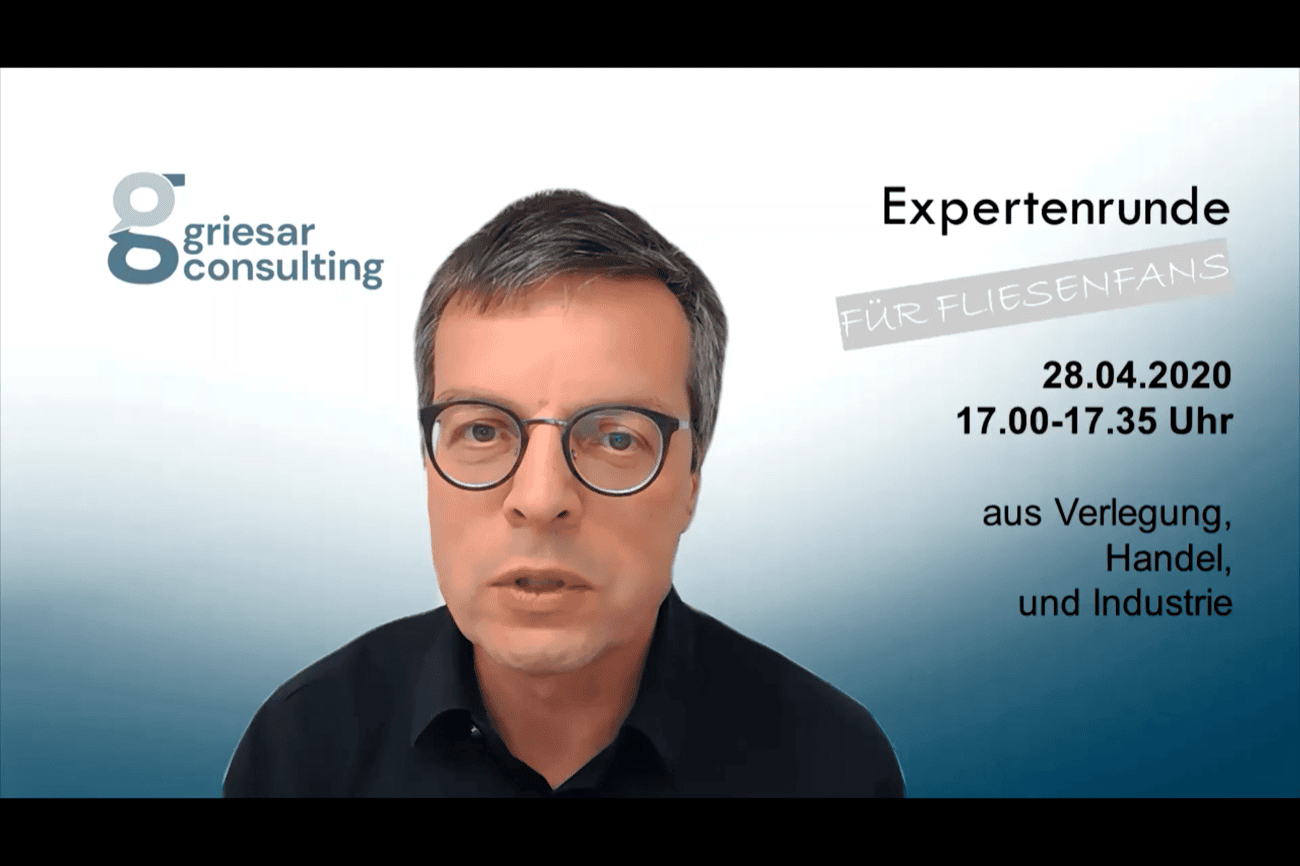 28. April 2020Ulrich Griesar, Unternehmensberater und Businesstrainer für die Fliesenbranche, organisiert eine virtuelle Expertenrunde aus Verlegung, Handel und Industrie. Termin ist Dienstag, 28.04.2020, 17.00-17.35 Uhr mit dem Thema: Positive und negative Erfahrungen im Tagesgeschäft der Fliesenbranche.Veranstalter und Gastgeber: Ulrich Griesar (griesar consulting) Mehr dazu und kostenfreie Anmeldung unter ug@griesar.com oder Tel. 0157-887 257 16. Anzeige Anzeigeweitere Beiträge über Schlüter