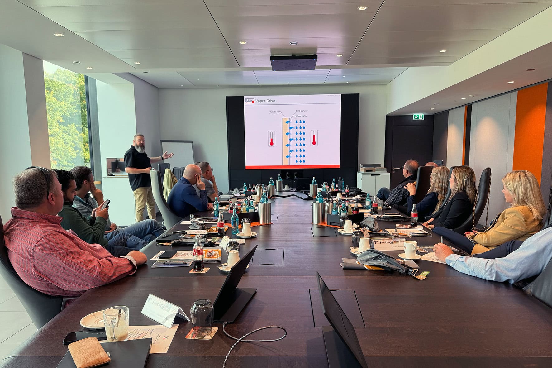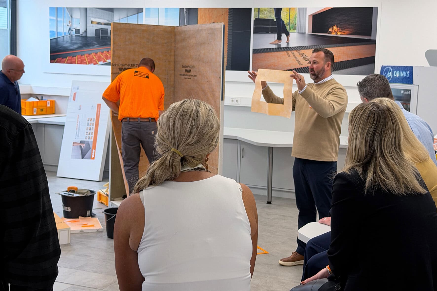 Im Fokus des Programms stand ein Vortrag zum Thema „Abdichtung“, gefolgt von einem Rundgang durch Produktion und Logistik. Höhepunkt war ein praxisnaher Workshop in der Schlüter-WorkBox: Hier demonstrierte Vorführmeister Shon Parker eindrucksvoll, wie schnell und unkompliziert Abdichtungen mit Schlüter-Systemlösungen umgesetzt werden können. Zum Einsatz kamen auch Produkte aus dem nordamerikanischen Sortiment, speziell angepasst an die dort geltenden Standards und Methoden. Der Eindruck vor Ort bestätigte: Schlüter-Systeme kombinieren Effizienz, Zuverlässigkeit und hohe Verarbeitungsstandards im Hotelbau.