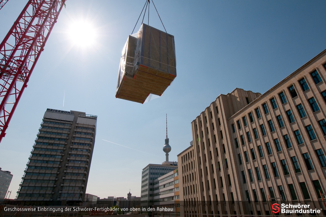 Einbringung eines fertigen Schwörer-Fertigbad-Moduls an der Baustelle. Fotos: Schwörer