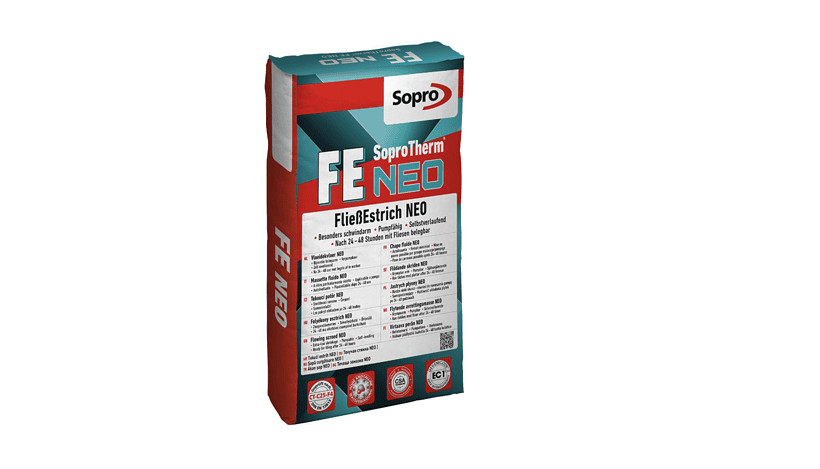Bei SoproTherm FE NEO handelt es sich um eine Trockenfertigmischung zur Herstellung besonders schwindarmer und früh belegereifer Zementfließestriche – für die nachfolgende Verlegung von Bodenbelagsbaustoffen aller Art. Dank CSA-Technologie ist das Produkt CO2-reduziert und somit besonders nachhaltig. Der selbstverlaufende FließEstrich ist einfach und schnell in der Anwendung und aufgrund seiner Pumpfähigkeit lässt sich SoproTherm FE NEO auch effizient auf Großbaustellen einsetzen.