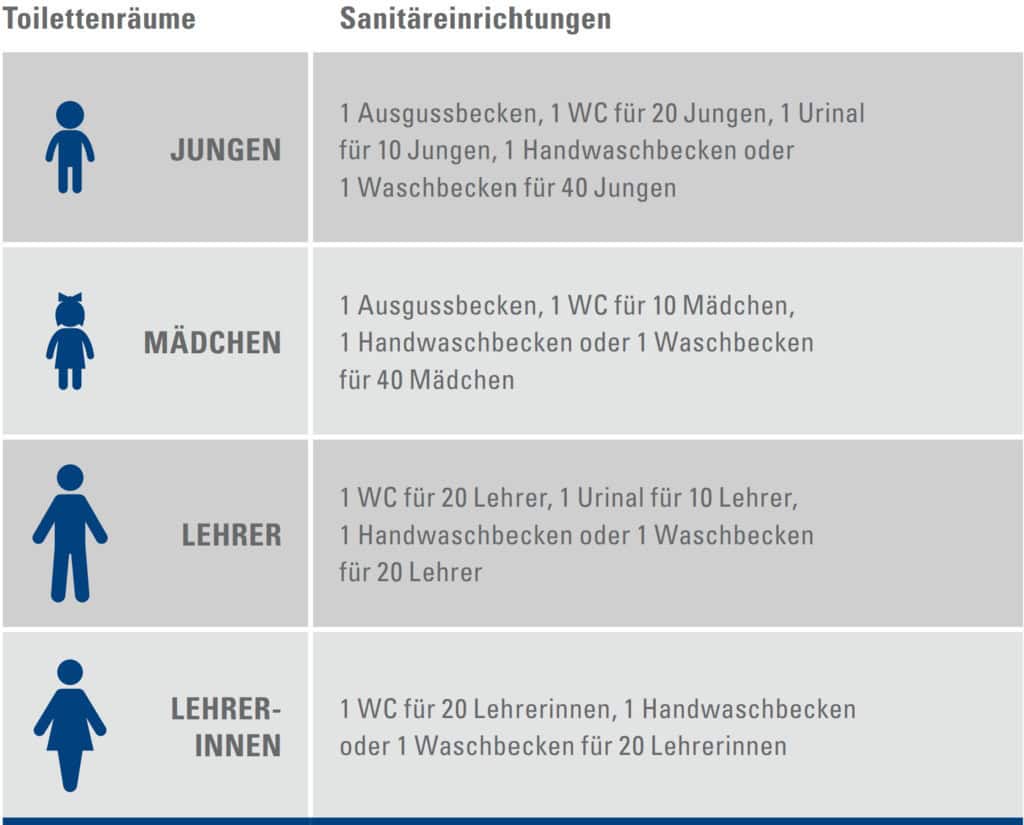 Die Tabelle zeigt Richtwerte für die Sanitäranlagen in Schulen: